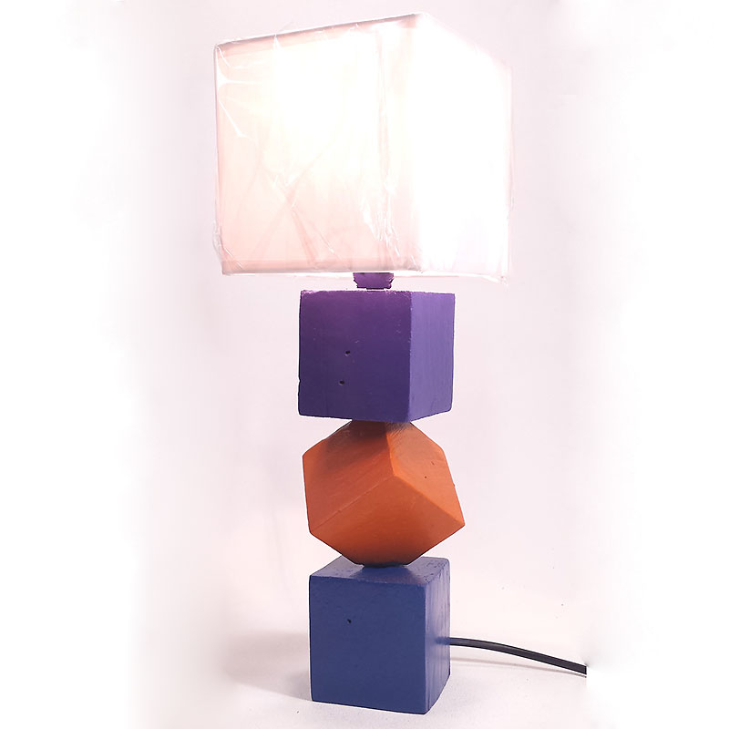 Lampe réalisée à partir de carrés de palettes, peints en violet, orange et bleu, des couleurs inspirées d’un couché de soleil.