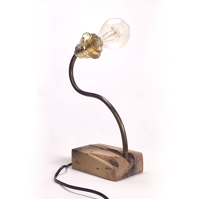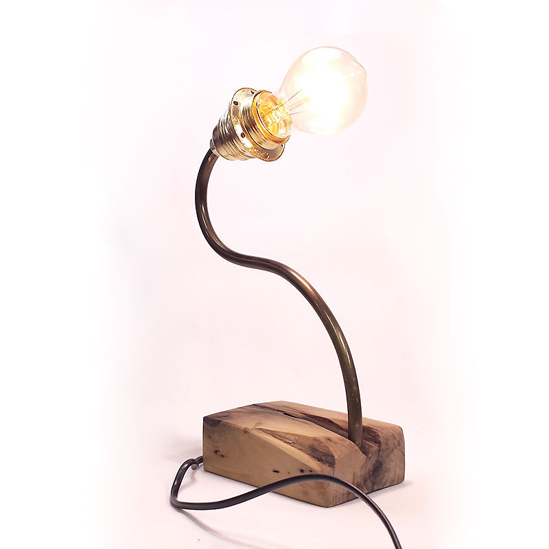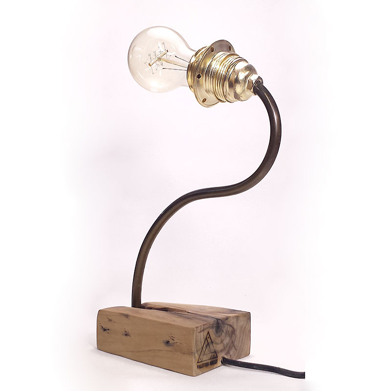 Lampe réaliséeà partir d’un chevron de palette et de laiton avec son ampoule Edison.