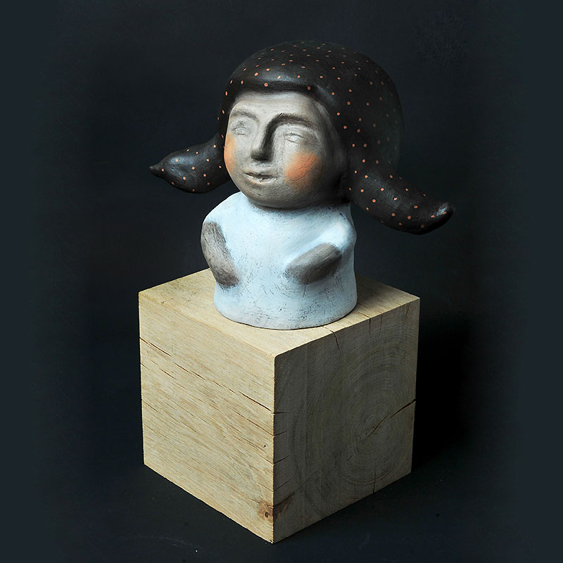Sculpture terre cuite – Patine acrylique avec socle en bois.