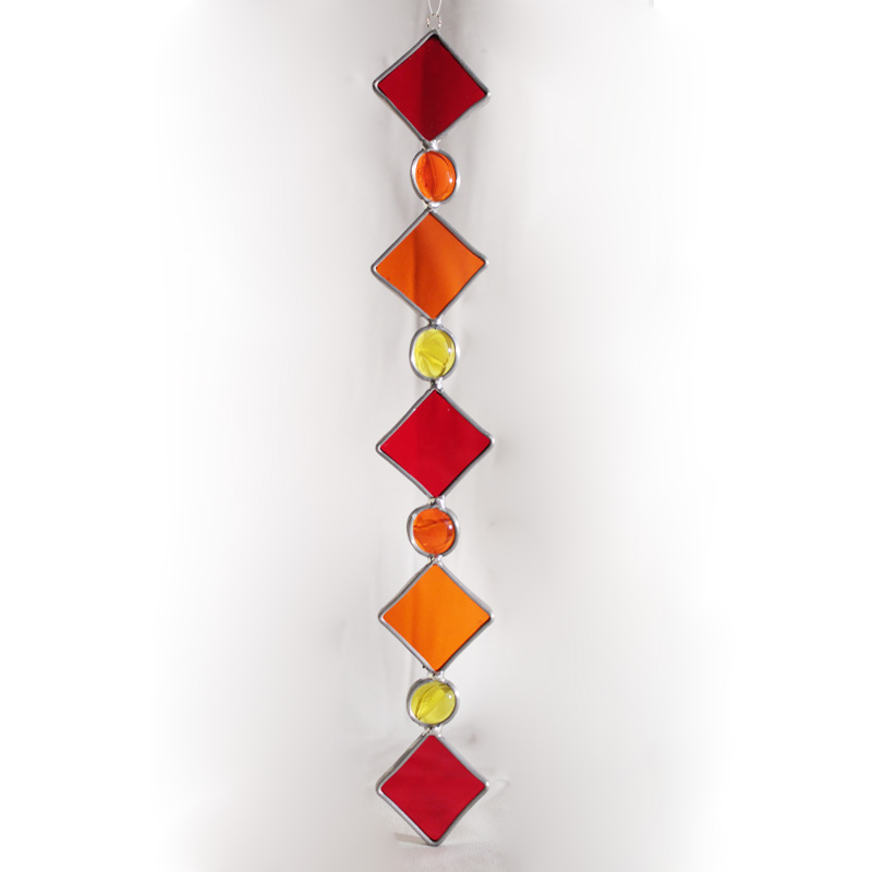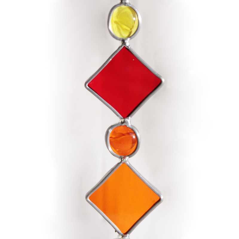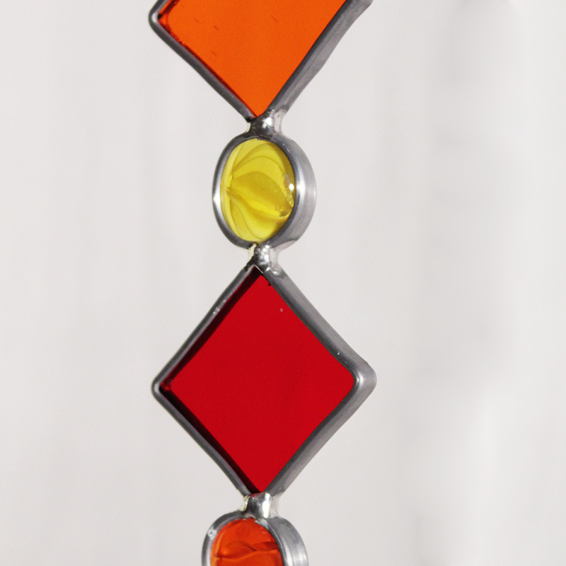 Verre transparent rouge et orange pour les losanges, cabochons orange et jaune
