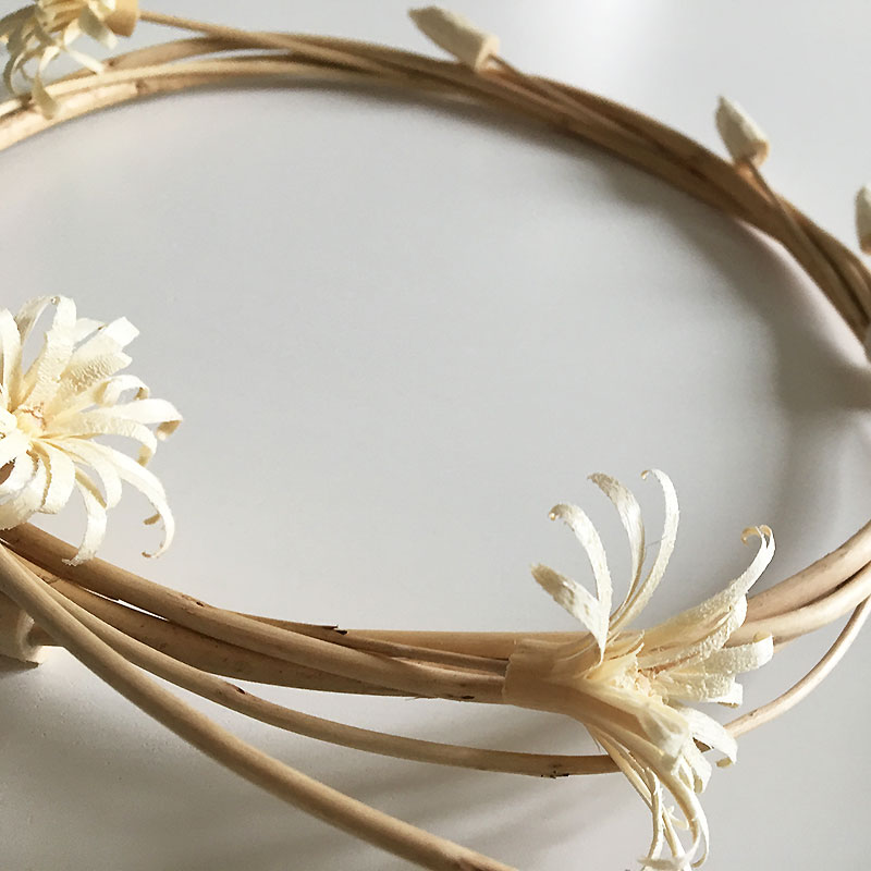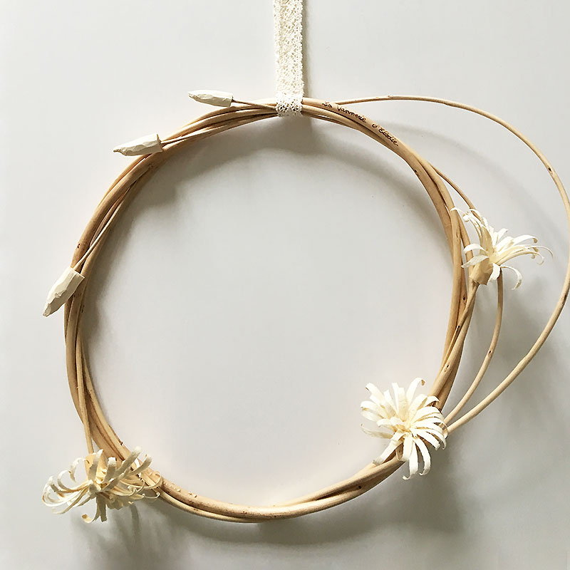 Vannerie en osier décortiqué blanc naturel et dentelle à suspendre.